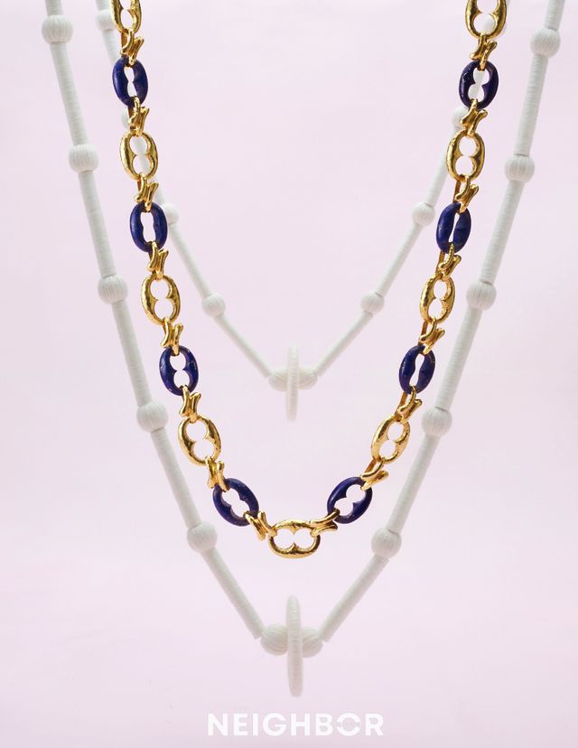 Van Cleef&Arpels 수작업으로 표면에 은은한 텍스처를 부여한 옐로 골드 모티프와 라피스라줄리 모티프가 교차하는 감각적인 디자인의 롱 네크리스(1974).