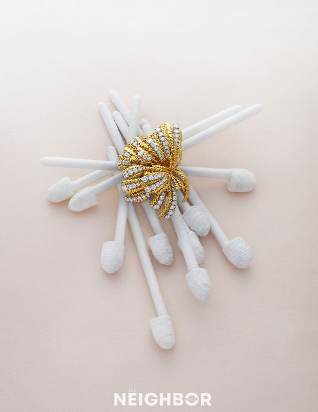 Van Cleef&Arpels 플래티넘과 화이트·옐로·로즈 골드 소재의 볼드한 꽃 모티프 위로 다이아몬드를 세팅해 낭만적 무드를 강조한 플뢰르 부아(Fleur Bois) 클립(1960).