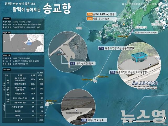 (화성=뉴스영 이현정 기자) 화성특례시 서신면 송교항이 해양수산부 주관 2025년 어촌신활력증진사업에 최종 선정돼 국비 35억 원을 확보했다고 26일 밝혔다.