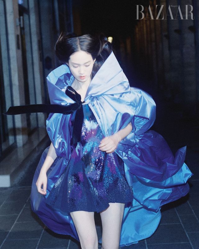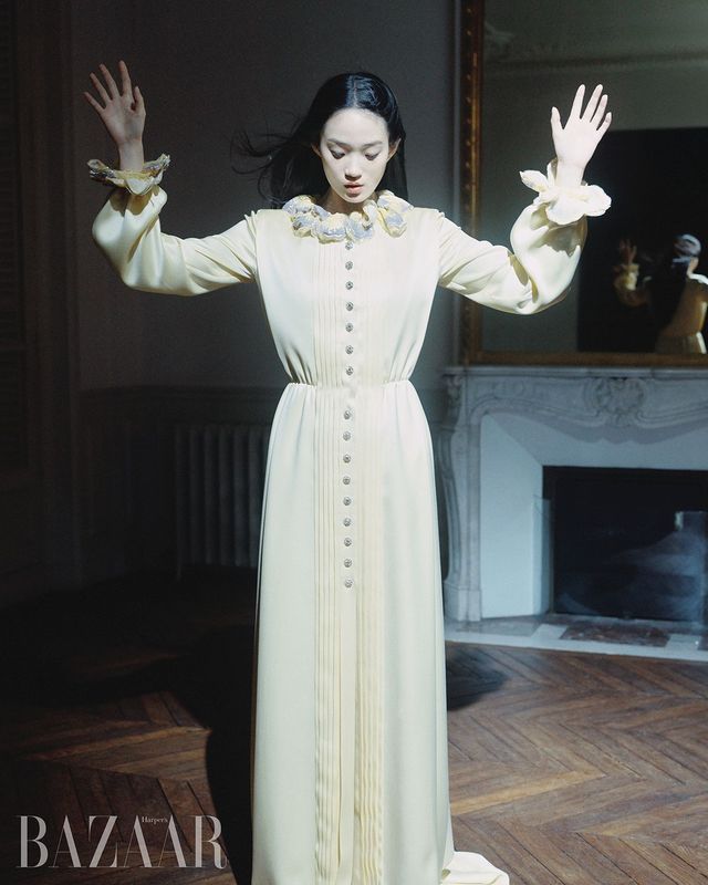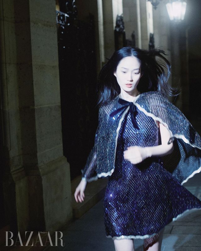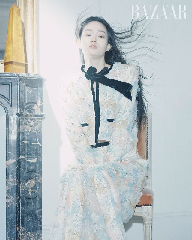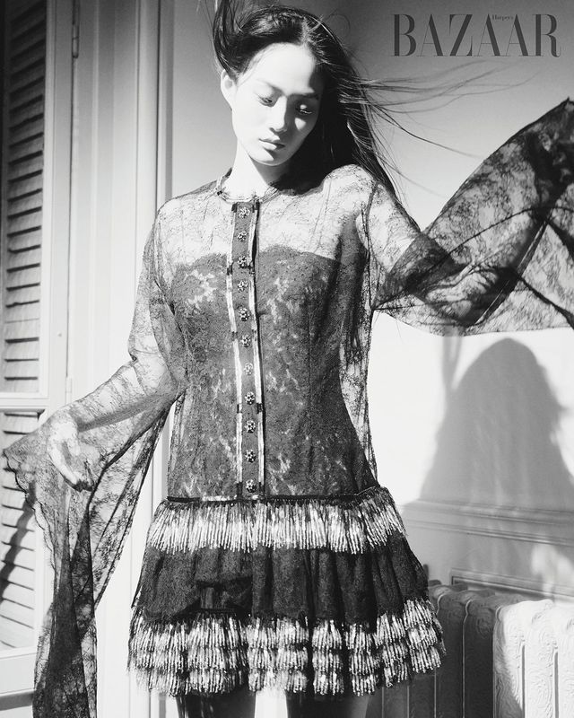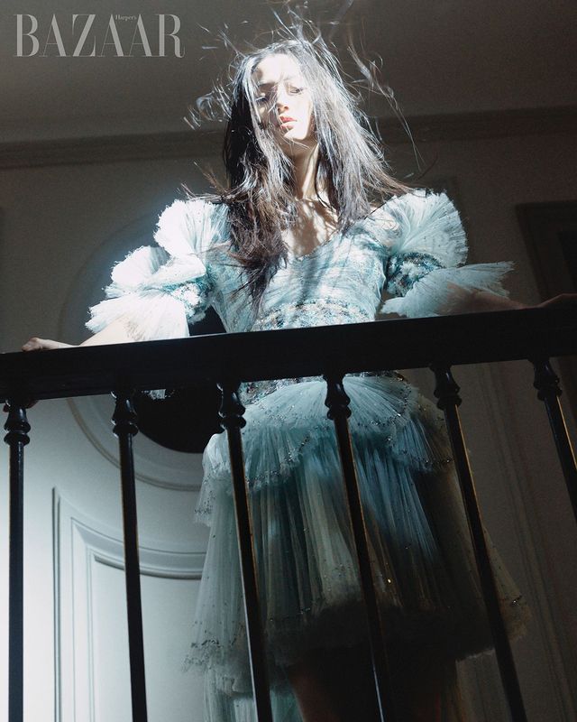 섬세한 비즈·시퀸 장식과 프린지 디테일의 튤 드레스, 엠브로이더리 팬츠, 샌들 힐은 모두 Chanel Haute Couture.
