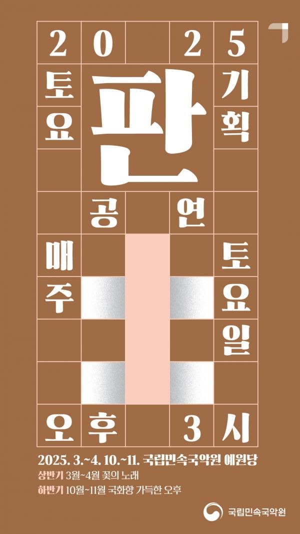 국립민속국악원이 2025년 한 해 동안 총 10회에 걸쳐 토요 기획공연 '판'을 선보인다. 전통예술의 매력을 조명하고 국악의 저변을 확대하겠다는 의도다.