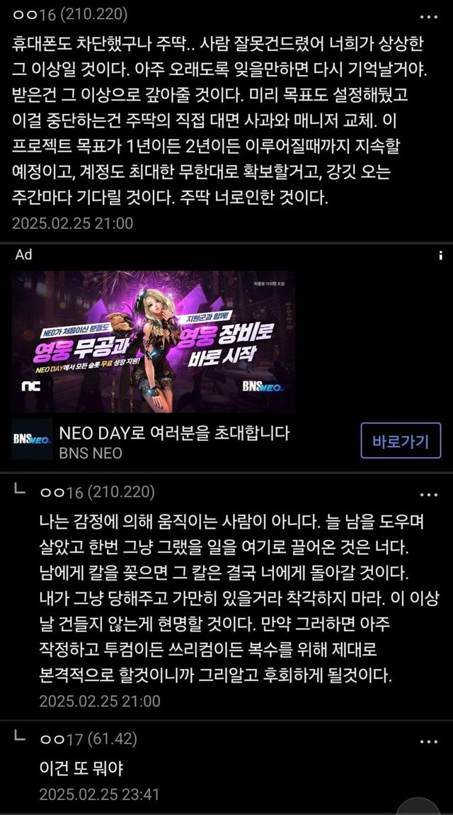 사람 잘못건드렸어 너희가 상상한 그 이상일 것이다. 아주 오래도록 잊을만하면 다시 기억날거야. 받은건 그 이상으로 갚아줄 것이다. 미리 목표도 설정해뒀고 이걸 중단하는건 주딱의 직접 대면 사과와 매니저 교체. 이 프로젝트 목표가 1년이든 2년이든 이루어질때까지 지속할 예정이고, 계정도 최대한 무한대로 확보할거고, 강깃 오는 주간마다 기다릴 것이다. 주딱 너로인한 것이다. 나는 감정에 의해 움직이는 사람이 아니다. 늘 남을 도우며 살았고 한번 그냥 그랬을 일을 여기로 끌어온 것은 너다. 남에게 칼을 꽂으면 그 칼은 결국 너에게 돌아갈 것이다. 내가 그냥 당해주고 가만히 있을거라 착각하지 마라. 이 이상 날 건들지 않는게 현명할 것이다. 만약 그러하면 아주 작정하고 투컴이든 쓰리컴이든 복수를 위해 제대로 본격적으로 할것이니까 그리알고 후회하게 될것이다.