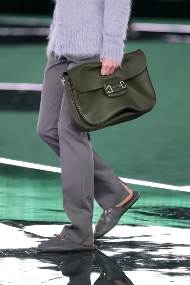 이번 컬렉션의 구찌는 전통적인 남성복과 여성복의 구분을 넘어서, 서로의 요소를 자연스럽게 결합하는 방식으로 스타일을 확장했습니다. 그린, 모브, 브라운, 그레이 등 세련된 컬러 팔레트가 남성과 여성 룩을 자연스럽게 연결하는데요. 남성복에서 사용된 테일러링 원단이 여성복으로 변형되며, 더욱 선명한 실루엣과 정교한 구조가 돋보이는 수트 룩이 탄생했습니다.