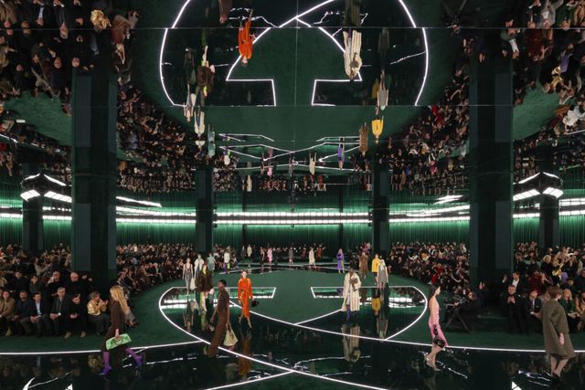 런웨이는 브랜드의 유산을 기리는 특별한 공간으로 꾸며졌습니다. 이번 패션쇼는 구찌 창립자인 구찌오 구찌(Guccio Gucci)의 이니셜에서 탄생한 인터로킹 G 엠블럼의 50주년을 기념하며, 이를 캣워크 무대에 반영했는데요. 다크 그린 컬러의 인터로킹 G 패턴이 브랜드의 헤리티지를 상징적으로 표현했고, 패션쇼의 몰입도를 극대화했습니다. 또한 아카데미 음악상 수상 작곡가인 저스틴 허위츠(Justin Hurwitz)가 구찌를 위해 특별히 작곡한 오케스트라 연주까지 만나볼 수 있었죠.