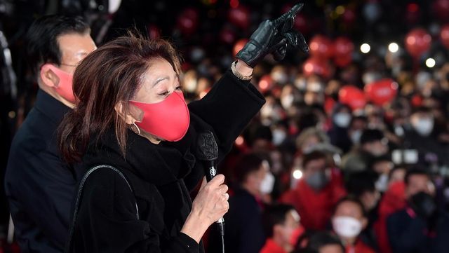 배우 김부선이 제20대 대통령 선거에서 윤석열 당시 국민의힘 대선 후보의 마지막 집중 유세에 깜짝 찬조연설자로 등장해 눈길을 모았다. / 뉴스1