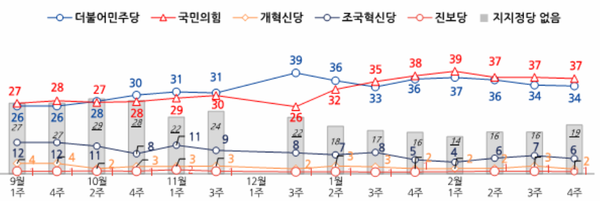 여론조사기관 엠브레인퍼블릭·케이스탯리서치·코리아리서치·한국리서치가 지난 24일~26일 전국 만 18세 이상 남녀 1001명을 대상으로 실시한 여론조사에서 정당 지지율은 국민의힘 37%(-), 더불어민주당 34%(-), 조국혁신당 6%(1%p↓), 개혁신당 2%(1%p↓), 진보당 1%(-)로 나타났다.