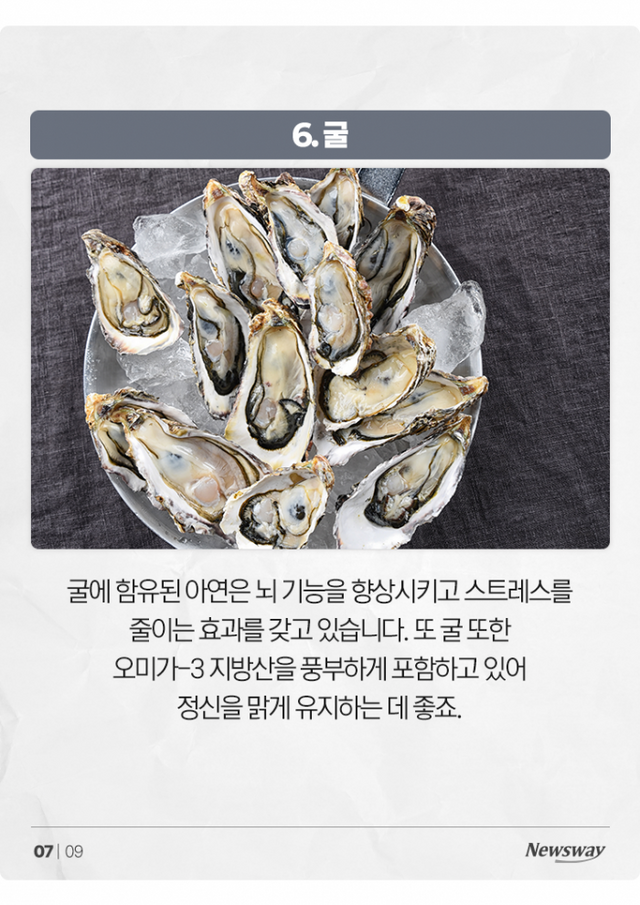 6. 굴 = 굴에 함유된 아연은 뇌 기능을 향상시키고 스트레스를 줄이는 효과를 갖고 있습니다. 또 굴 또한 오미가-3 지방산을 풍부하게 포함하고 있어 정신을 정신을 맑게 유지하는 데 좋죠.
