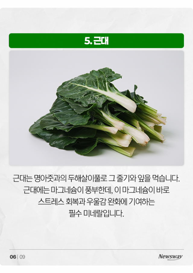 5. 근대 = 근대는 명아줏과의 두해살이풀로 그 줄기와 잎을 먹습니다. 근대에는 마그네슘이 풍부한데, 이 마그네슘이 바로 스트레스 회복과 우울감 완화에 기여하는 필수 미네랄입니다.