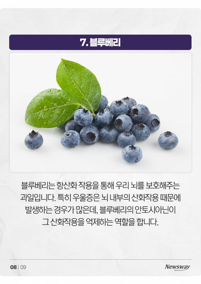 7. 블루베리 = 블루베리는 항산화 작용을 통해 우리 뇌를 보호해주는 과일입니다. 특히 우울증은 뇌 내부의 산화작용 때문에 발생하는 경우가 많은데, 블루베리의 안토시아닌이 그 산화작용을 억제하는 역할을 합니다.