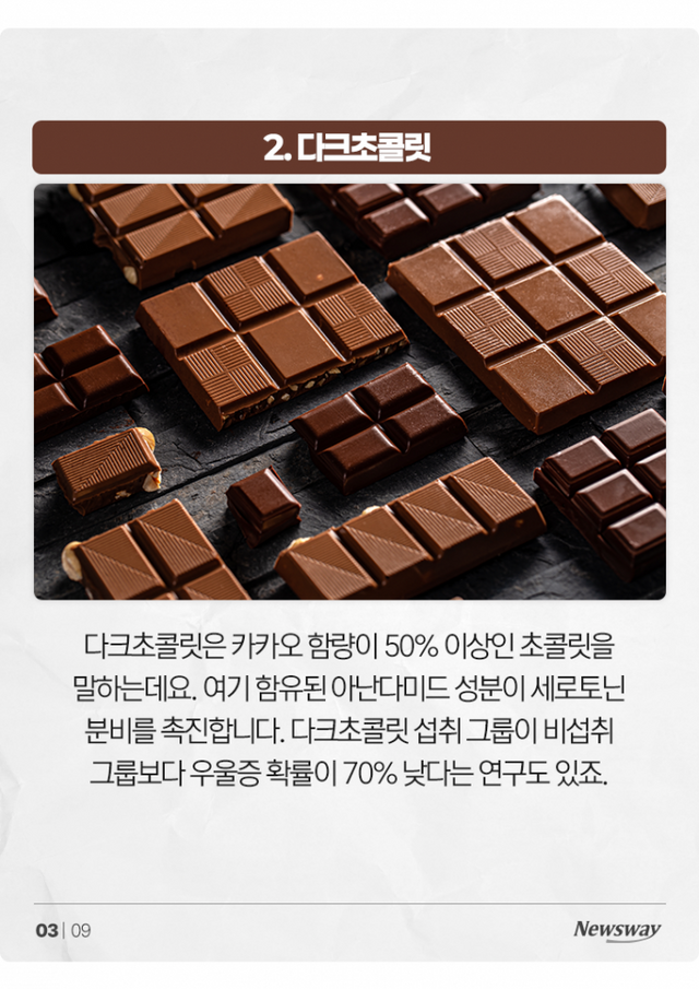 2. 다크초콜릿 = 다크초콜릿은 카카오 함량이 50% 이상인 초콜릿을 말하는데요. 여기 함유된 아난다미드 성분이 세로토닌 분비를 촉진합니다. 다크초콜릿 섭취 그룹이 비섭취 그룹보다 우울증 확률이 70% 낮다는 연구도 있죠.