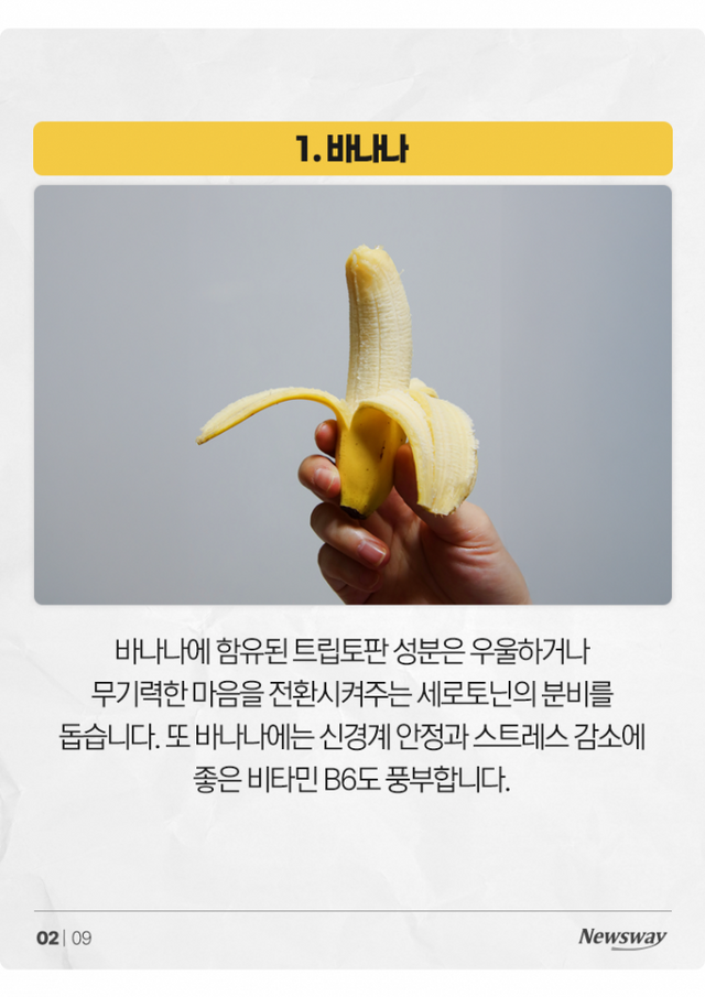 1. 바나나 = 바나나에 함유된 트립토판 성분은 우울하거나 무기력한 마음을 전환시켜주는 세로토닌의 분비를 돕습니다. 또 바나나에는 신경계 안정과 스트레스 감소에 좋은 비타민 B6도 풍부합니다.