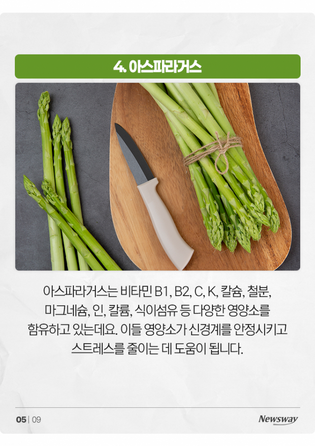 4. 아스파라거스 = 아스파라거스는 비타민 B1, B2, C, K, 칼슘, 철분, 마그네슘, 인, 칼륨, 식이섬유 등 다양한 영양소를 함유하고 있는데요. 이들 영양소가 신경계를 안정시키고 스트레스를 줄이는 데 도움이 됩니다.