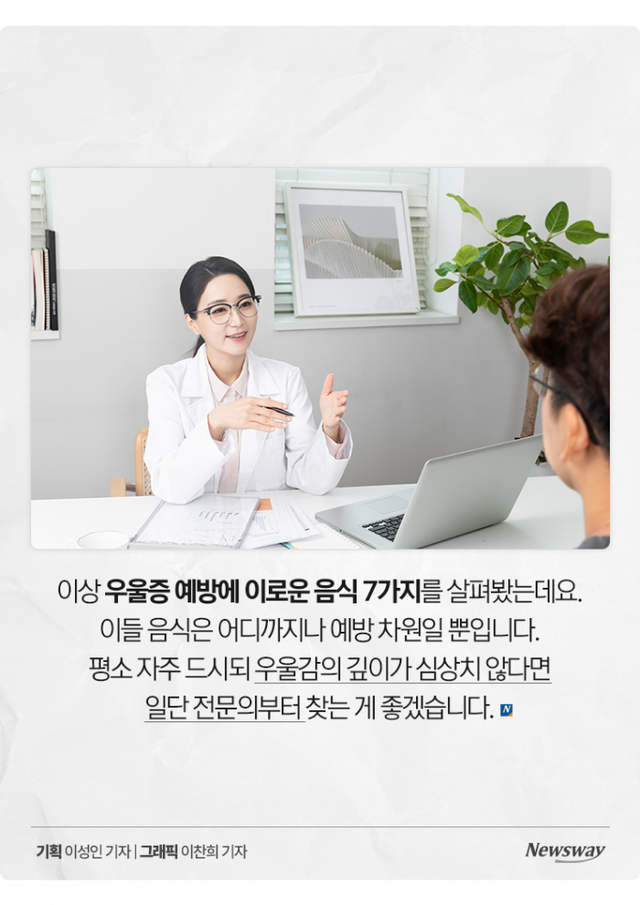 이상 우울증 예방에 이로운 음식 7가지를 살펴봤는데요. 이들 음식은 어디까지나 예방 차원일 뿐입니다. 평소 자주 드시되 우울감의 깊이가 심상치 않다면 일단 전문의부터 찾는 게 좋겠습니다.