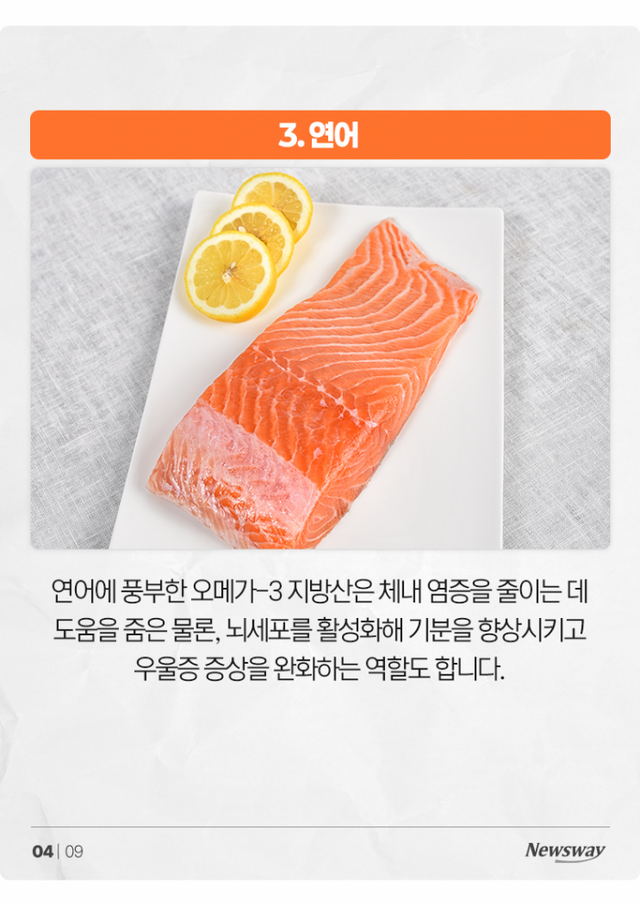 3. 연어 = 연어에 풍부한 오메가-3 지방산은 체내 염증을 줄이는 데 도움을 줌은 물론, 뇌세포를 활성화해 기분을 향상시키고 우울증 증상을 완화하는 역할도 합니다.
