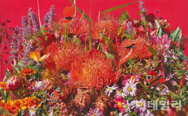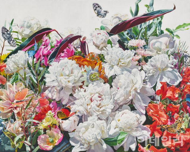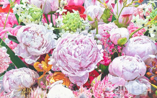 의심을 부르는 그림. 작가 박종필(48)의 작업이 바로 그거다. 작품마다 빠짐없이 화면을 채우는 ‘꽃’은 사실 그저 도구일 뿐. 꽃으로 채우는 미적 성취감이 작가 작업의 핵심은 아니란 얘기다. 탱탱한 생화 사이에 더 탱탱한 조화를 박아두곤 말이다. “함부로 판단하지 말고 본질을 보라”고 우아하게 이르고 있으니까. 생화와 조화를 식별해내는 기준이 아니라 영원히 시들지 않는 꽃이 진짜일 리가 없다는 철학을 심어둔 거다.
