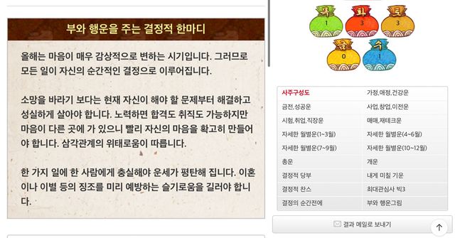 온라인 사주 전문 사이트 '위키사주'는 연인, 결혼지수와 성격, 재물운, 애정운, 배우자운, 철저한 궁합분석, 그리고 두 사람의 연애운을 상승시켜주는 부적까지 모두 다루고 있다. 더불어 오랜 전통을 바탕으로 한 사주팔자와 현대적인 분석 기술을 결합하여 각자의 운명을 상세히 분석하고 있는 위키사주는 이름과 생년월일, 태어난 시간과 성별을 입력하면 간단하게 이용할 수 있다.
