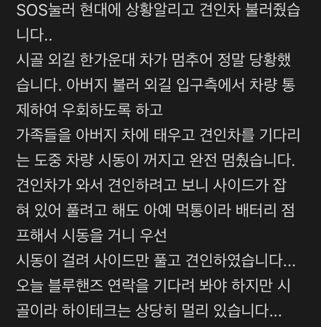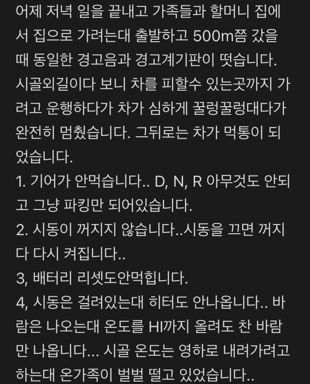 3.당일 저녁 가족들을 모두 태우고 친적집으로 향하던중 동일한 현상 발생,이번에는 변속기 먹통,시동 먹통,공조기 먹통 까지 차가 완전히 뻗어버림.결국 견인차가 와서 끌고감.