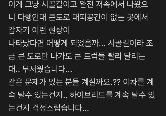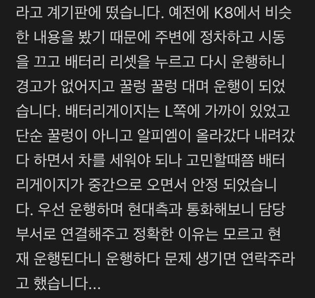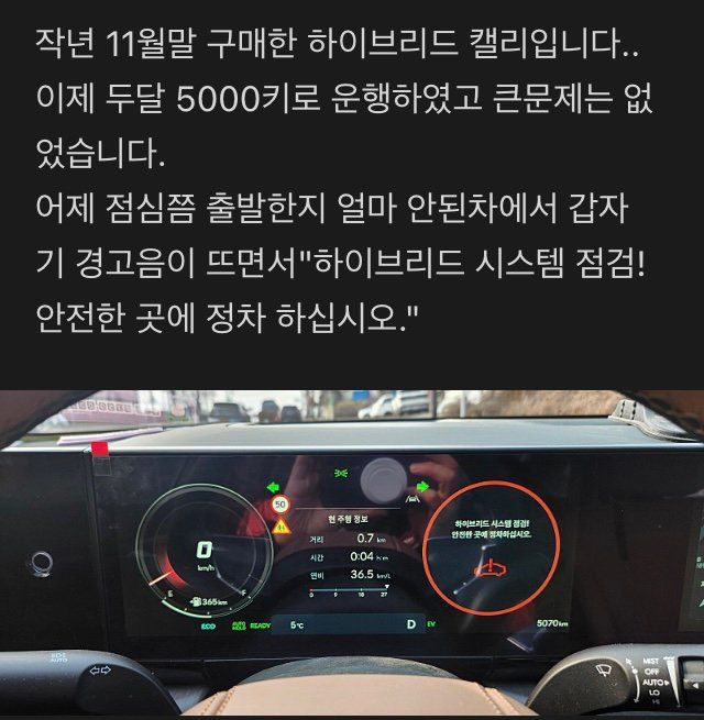 2.어제 점심쯤 첫번째 이상현상 나타남.주행중 하이브리드 시스템 경고등이 점등되며 차량 동력에 이상이 생겼음을 감지,다행히 갓길에 정차후 시동을 다시 걸었더니 운행이 가능해짐.현대차측에 전화를 해서 이런일이 있었다고 알렸더니 현대차측에서는 ‘정확한 이유는 우리도 모르겠고 현재 운행이 가능한 상황이라면 별 문제가 없으니 또 같은 현상이 일어나면 연락을 주라’라는 답변을 남기고 통화 종료