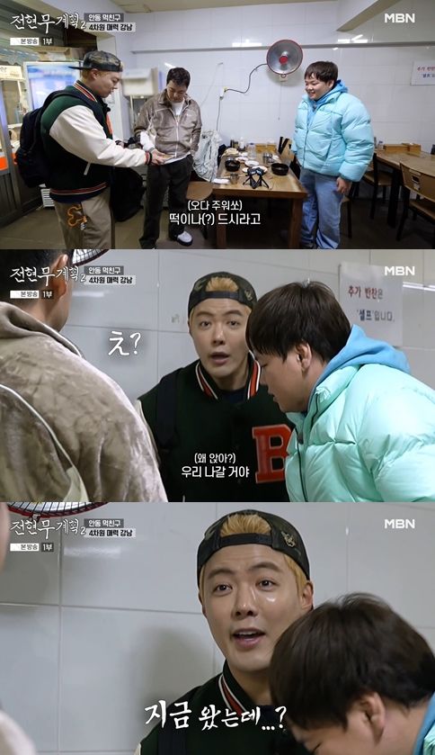 전현무는 "일단 앉아라. 지금 왔는데 맛있는 거 먹여야지"라고 강남을 진정시켰다. 이어 세 사람은 다음 식당을 어디로 갈지에 대해 대화를 나눴다.