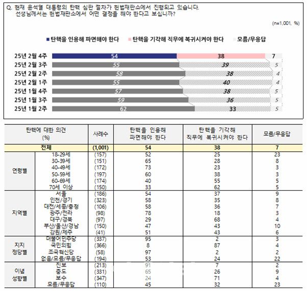 그런데 제가 이거 궁금한 게 뭐냐 하면 대통령에 대해서 그렇게 한다 근데 또 대통령을 탄핵을 인용해 파면해야 한다가 이 조사에서 54%예요.