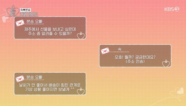 구본승은 “오다 주웠다”면서 제주도 초콜릿을 깜짝선물로 건넸다. 구본승은 “어머니 걸 사면서 샀다. 곧 밸런타인데이 아니냐”고 했고, 김숙은 “엄마랑 나랑 동급이냐. 섬세하다”고 감동했다. 이어 김숙은 “요즘 오만추 톡방에 제일 많은 얘기가 이유미, 황동주와 저랑 오빠다. 기분 좋다. 예쁘게 봐주는 거 아니냐”면서 “그땐 몰랐는데, 보면서 설레더라”고 마음을 전했다.