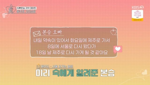 김숙이 “좀 공격적인 문자 보내봤냐”고 묻자 황동주는 “그게 좀 안 된다”고 쑥스러워하면서 직접적으론 아니고 간접적으론 한다. ‘다음에 봬요’라고 했다”고 밝혔다. 이에 김숙은 구본승의 문자를 언급하며 “난 문자 주고받을 때 본승 오빠가 마음에 들었던 게 있다. 한 번은 본인 스케줄을 다 써준 적 있다. 문자에 알맹이가 있었다”라며 형식적인 연락이 아니었다고 했다. 김숙이 직접적으로 표현해 보라고 하자 황동주는 “조심스러운 게 더 크다”고 했다.