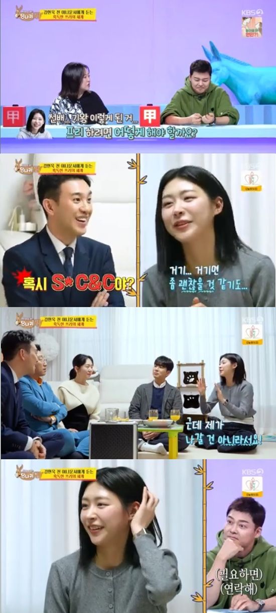 이날 김현욱은 엄지인에 대해 어느새 꼰대가 됐다는 얘기를 했다. 엄지인은 "저 선배님들 하던 거 그대로 하는 거다"라고 억울해 했다.