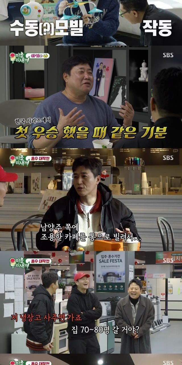 이어 김종민과 김준호가 혼수 구입을 위해 김종국을 만났다. 김종국은 "전 국민이 봤는데 어떻게 하나. 엊그제 시장 갔더니 김종민 냉장고 사줬냐고 어르신들이 다 물어보시더라"라며 공약을 이행하겠다고 큰소리쳤다.