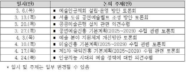 문체부에 따르면 이번 행사는 문체부가 추진하는 예술정책을 주제별로 소개하고 예술계 현장 의견을 폭넓게 수렴하기 위한 자리다. 유인촌 장관은 첫 간담회가 열리는 이달 6일 현장을 찾아 ‘예술인공제회 설립·운영 방안’ 등에 관해 참가자들과 논의할 예정이다.