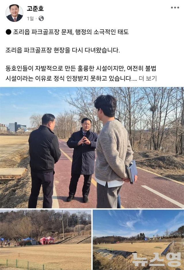 고준호 의원은 “조리읍 파크골프장 현장을 다시 다녀왔다”며 “동호인들이 자발적으로 만든 훌륭한 시설이지만, 여전히 불법 시설이라는 이유로 정식 인정받지 못하고 있다”고 상황을 밝혔다.