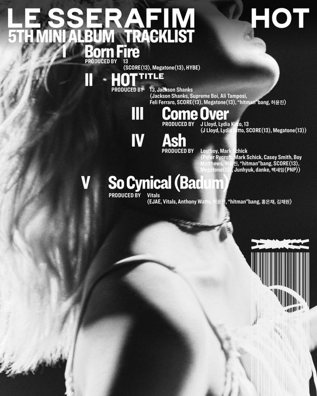 4일 0시 쏘스뮤직 공식 SNS에 게재된 르세라핌의 미니 5집 ‘핫’ 트랙리스트에 따르면, 새 앨범에는 신보와 동명의 타이틀곡 ‘핫’을 포함해 ‘본 파이어’, ‘컴 오버’, ‘애쉬’, ‘소 시니컬 (Badum)’ 등 총 다섯 곡이 수록된다.
