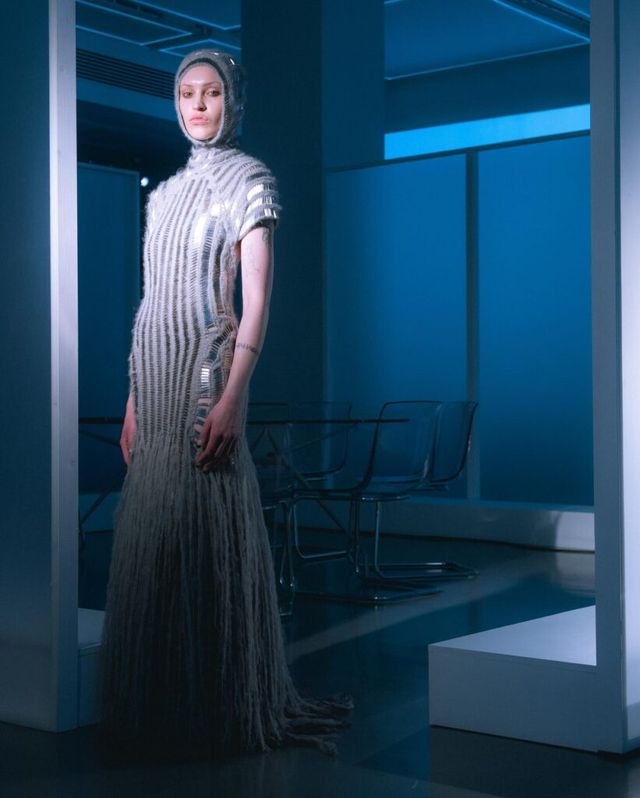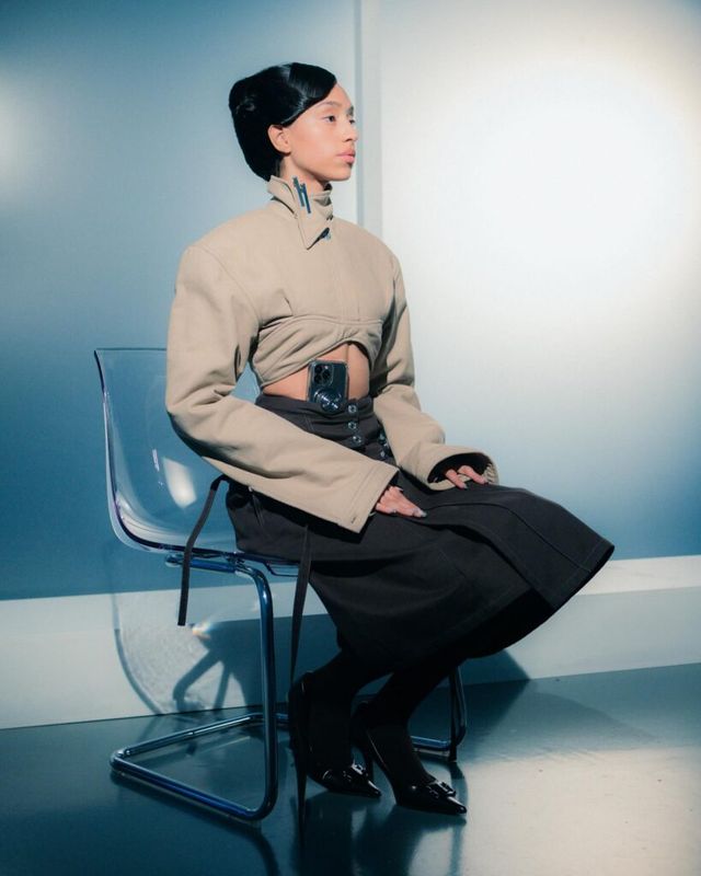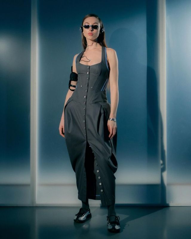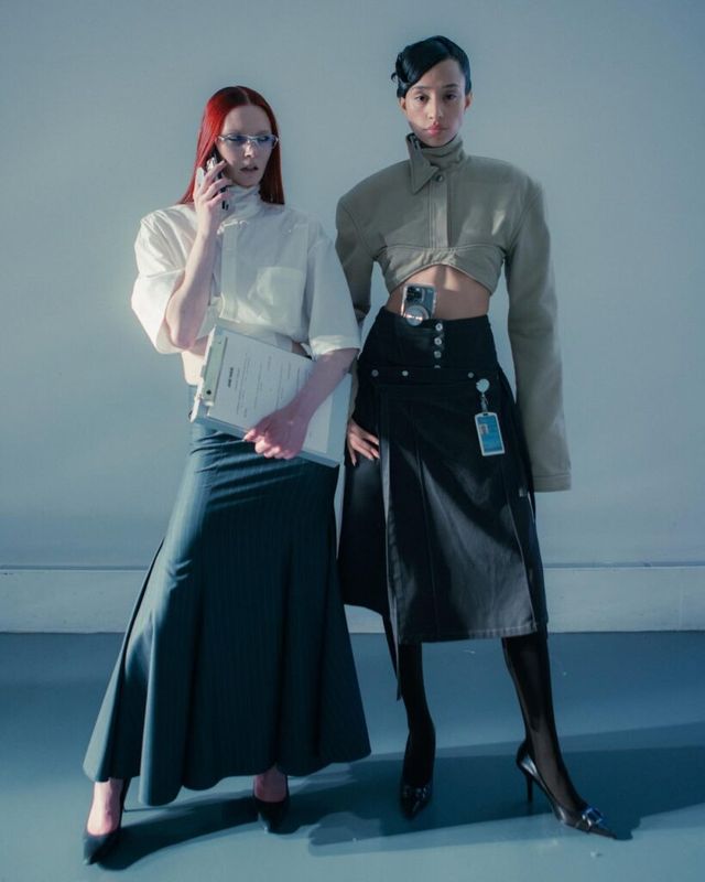 2021년 론칭한 제인 웨이드는 오피스웨어와 고프코어를 접목한 디자인을 선보입니다. 사무복과 일상복의 경계를 무너뜨리고자 하는 그녀는 오피스 웨어를 실용적으로 재해석해 고전적인 비즈니스 룩을 탈피하고자 하죠. 이번 컬렉션에 등장한 오버사이즈 재킷, 어깨를 강조한 트렌치코트, 하드웨어 디테일을 더한 드레스 등이 바로 그 예입니다. 벨트 고리에 건 아이디 카드, 서류 파일, 텀블러 등 실제 사무실에서 볼 법한 디테일도 놓치지 않았네요.