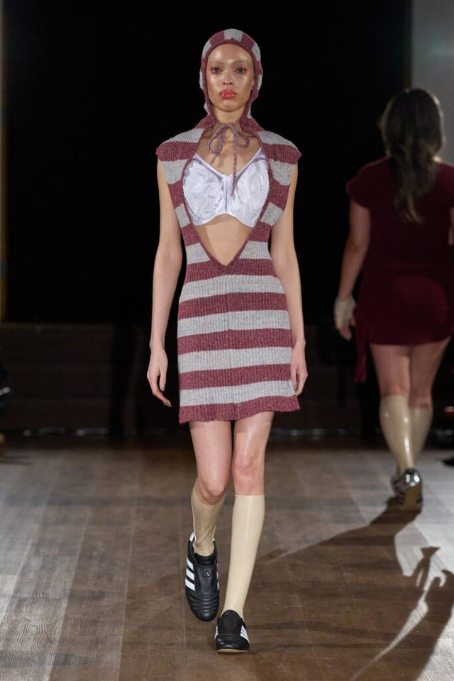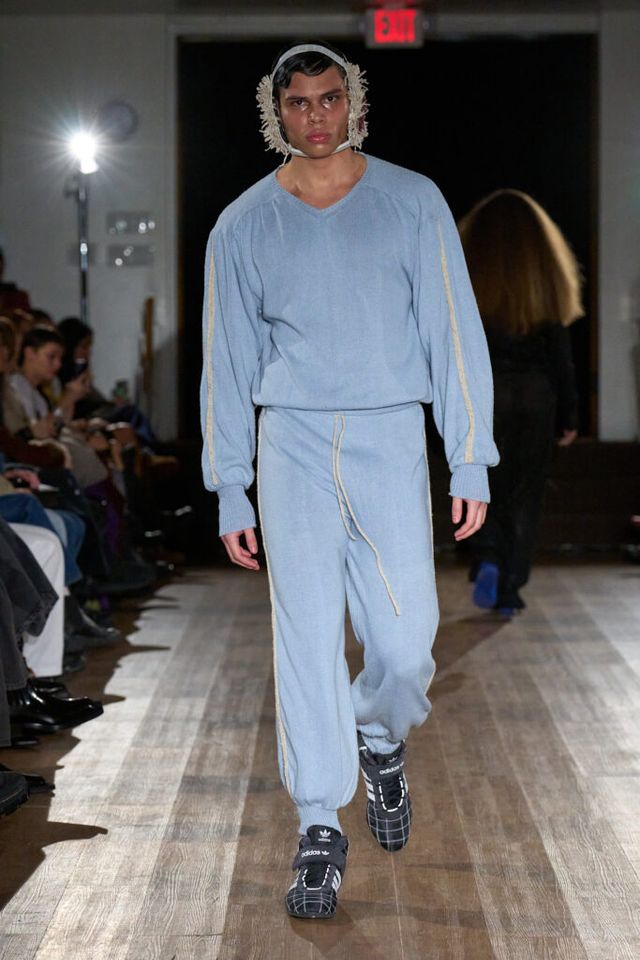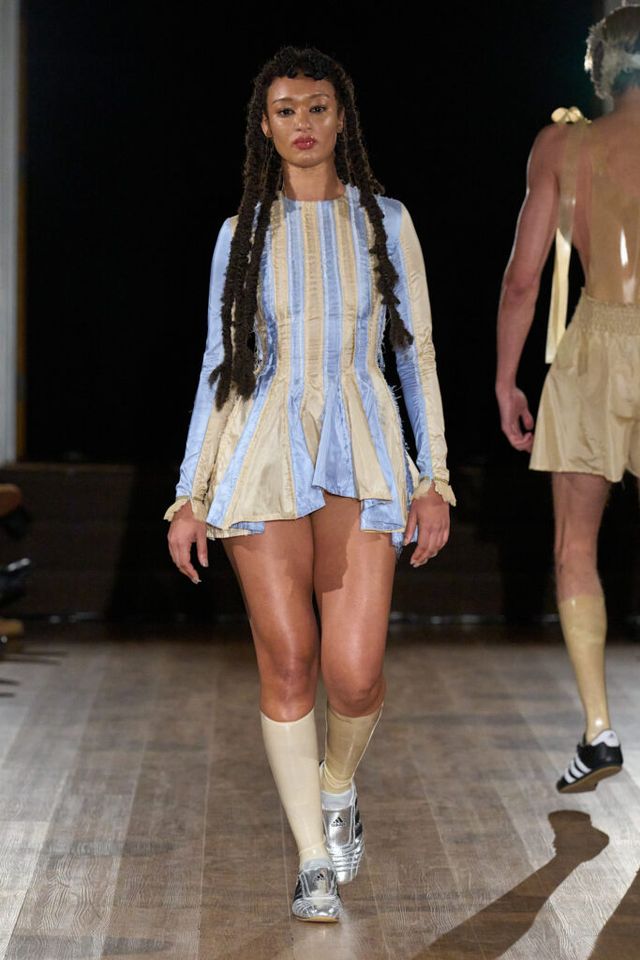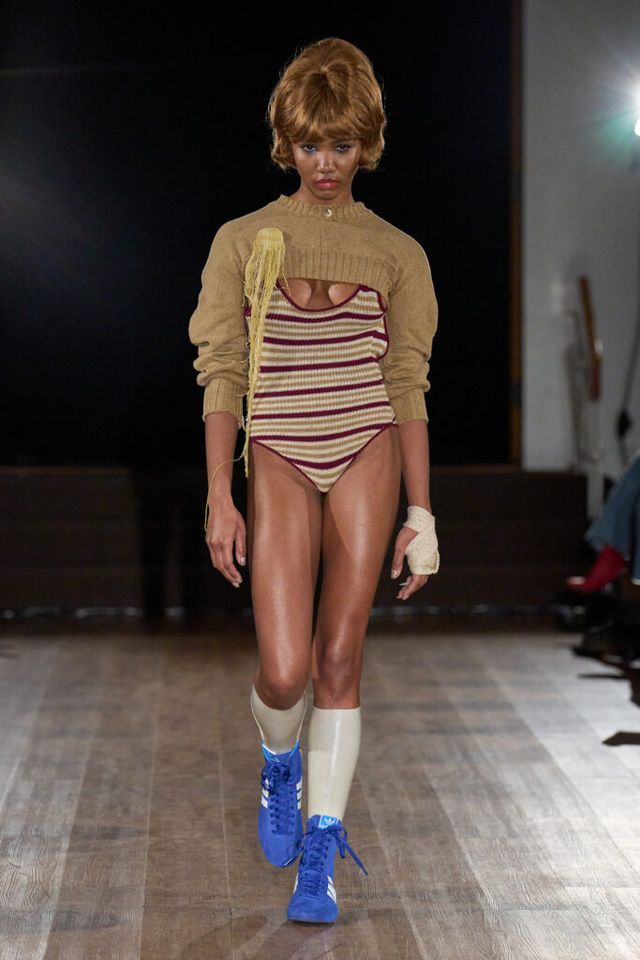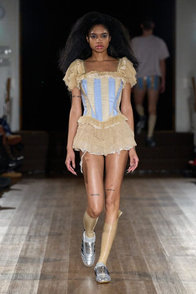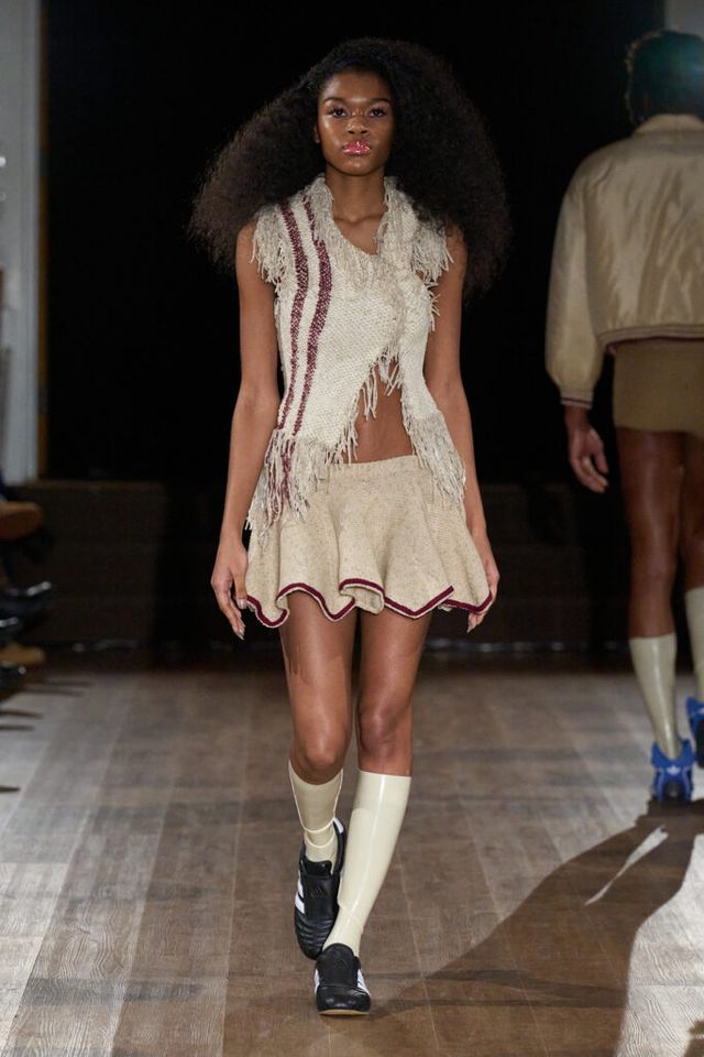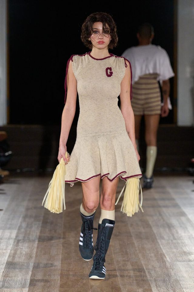 2025 F/W 시즌으로 브랜드의 두 번째 컬렉션을 선보이는 게이브 고든(GABE GORDON). 니트웨어를 주로 다루는 그답게 런웨이 곳곳에서 니트 소재를 만날 수 있었습니다. 이번 시즌은 ‘고무 남자 친구(RUBBER BOYFRIEND)’ 를 테마로 1980년대 고등학생들의 러브 스토리를 담았는데요. 치어리더와 레슬링 선수를 영감으로 삼았습니다. 컬렉션 전반에는 치어리더의 태슬 응원 도구, 응원복 그리고 레슬링 선수들이 사용하는 이어가드, 고무로 만든 레슬러 옷 등이 등장했죠.