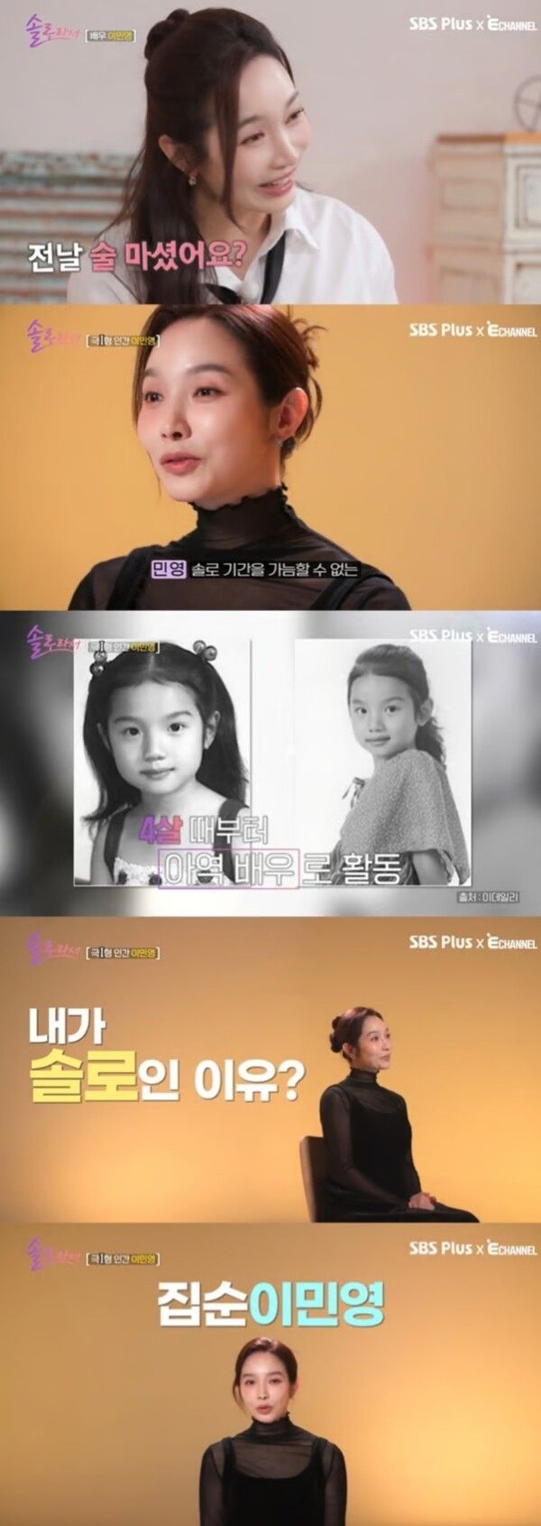 4일 방송된 SBS Plus·E채널 예능 '솔로라서'에 출연한 이민영은 자신을 "솔로 기간을 가늠할 수 없는 배우"라고 소개했다. 4살에 아역 배우로 데뷔해 오랜 시간 배우 활동을 이어온 그는 이날 방송에서 자신의 솔로 라이프를 공개했다.