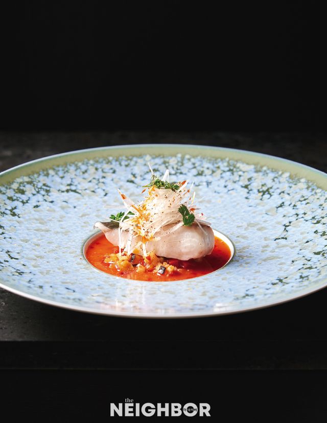 사천 요리 베이스에 유럽식 테크닉을 가미한 컨템퍼러리 중식 레스토랑 피에세. 이곳의 생선 디시 ‘사천식 포라소스와 생선찜’은 고추를 갈아서 발효한 포라장이 맛의 중심이다. 덕자를 소금누룩에 재운 뒤 파, 생강, 술과 함께 찌고, 포라장은 각종 채소, 오징어와 볶아 소스로 준비했다. 그릇에는 먼저 붉은 소스를 담은 뒤 생선을 올리고, 생파채와 산초로 마무리했다. 덕자의 고소함에 새콤, 달콤, 매콤한 소스가 어우러지고 팔각, 계피 등 중국 향신료가 맛의 포인트를 더한다.�c얌꿍이나 김치찌개를 연상시키는 맛으로, 메인 요리 전에 매콤함으로 분위기를 전환한다.