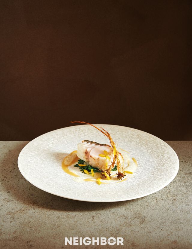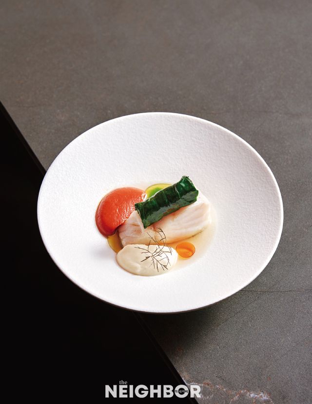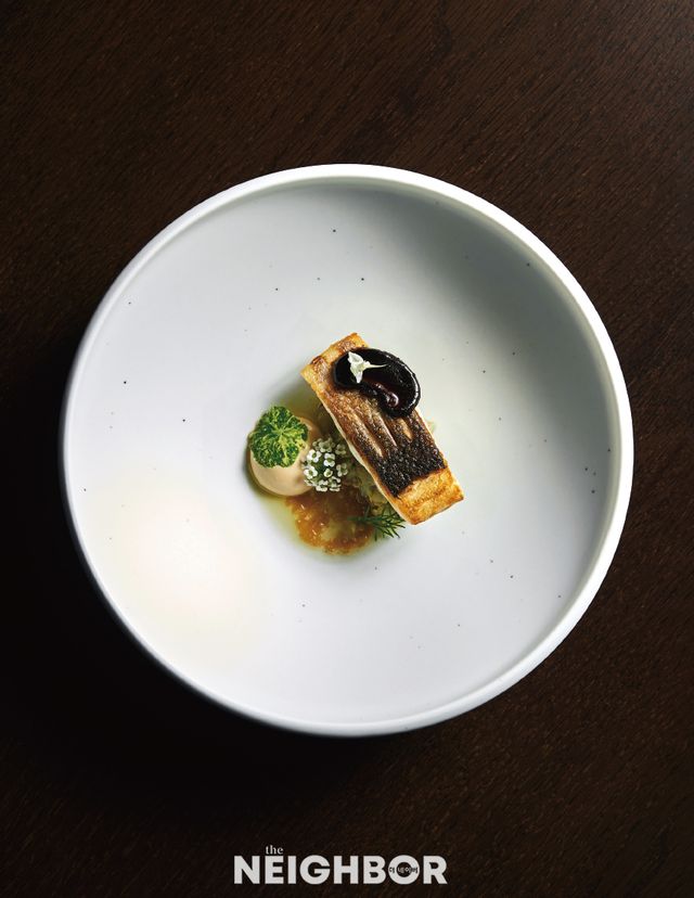 오사카 츠지 요리사 전문 학교를 졸업한 뒤 프렌치 레스토랑에서 경력을 쌓은 김성찬 셰프는 일식 조리법을 접목하되 클래식한 프렌치 요리를 추구한다. 봄 메뉴 ‘능성어, 냉이’의 능성어는 액체와 함께 천천히 익히는 푸알레 방식으로 조리해 껍질은 튀긴 듯 바삭하고 속은 촉촉한 식감을 구현했다. 버터에 빠르게 볶아낸 냉이 잎과 겉면을 살짝 구운 한치 위에 능성어를 올린 뒤, 저온에 튀긴 냉이 뿌리로 장식했다. 능성어 뼈를 우린 육수와 샬롯, 양송이를 볶은 뒤 베르무트를 더해 졸여낸 소스로 감칠맛과 크리미한 질감을 입힌 메뉴다.