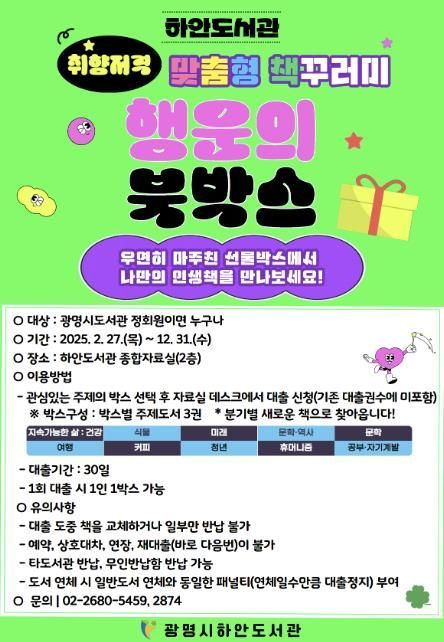 한편, 광명시 하안도서관은 행운의 북박스 외에도 ‘시민 참여형 도서관 문화 활성화 사업’의 일환으로 ‘신(新)선(選)한 서가’를 운영하고 있다.