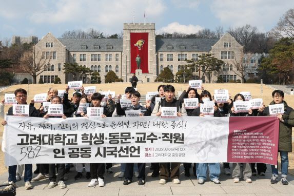고려대의 학생과 동문, 교수, 직원 등 20여명은 6일 낮 12시부터 서울 성북구 고려대 정문 앞에서 윤석열 대통령의 파면을 촉구하는 시국선언을 발표했다. 이들은 헌정질서를 훼손하고 내란 범죄를 정당화하려는 세력에 맞서 윤 대통령을 탄핵시켜야 한다고 목소리를 냈다.