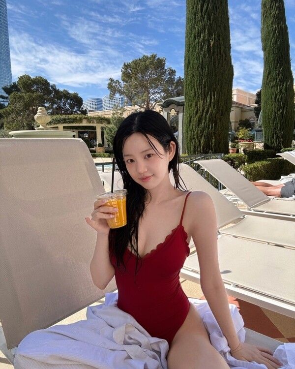 미국 라스베이거스 여행 중인 이유비는 수영장에서 여유로운 시간을 보내는 모습이다. 빨간색 수영복을 입은 그는 과하지 않은 노출에도 불구하고 건강미 넘치는 매력을 뽐냈다.