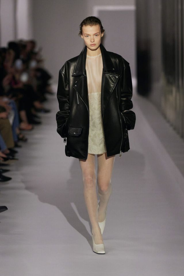 FAVORITE LOOK 스킨 톤의 시스루 원피스에 오버사이즈 레더 재킷을 걸친 룩