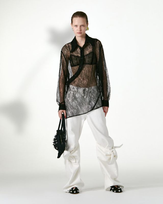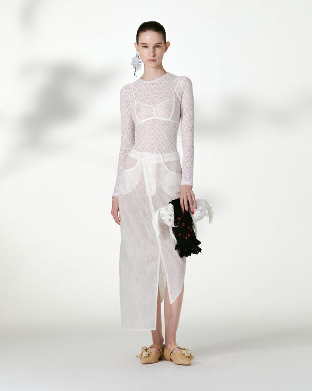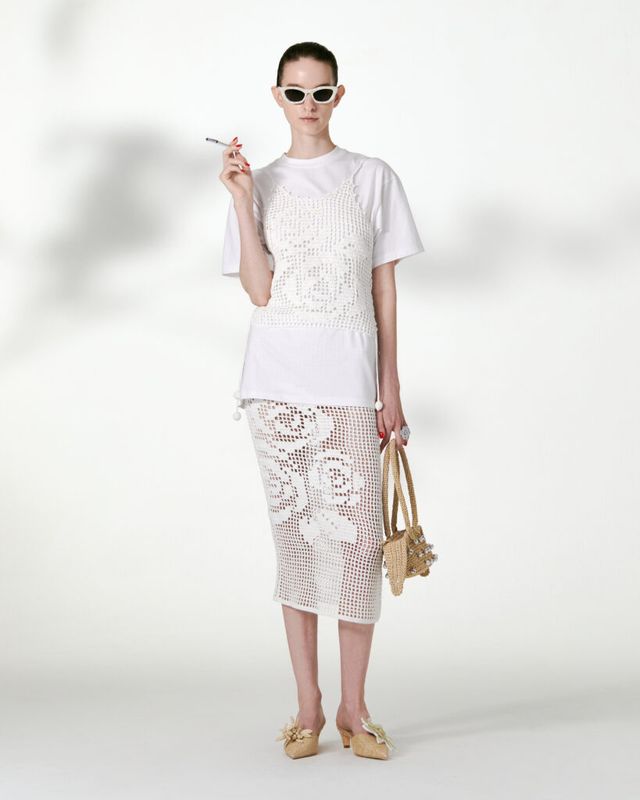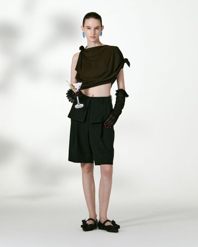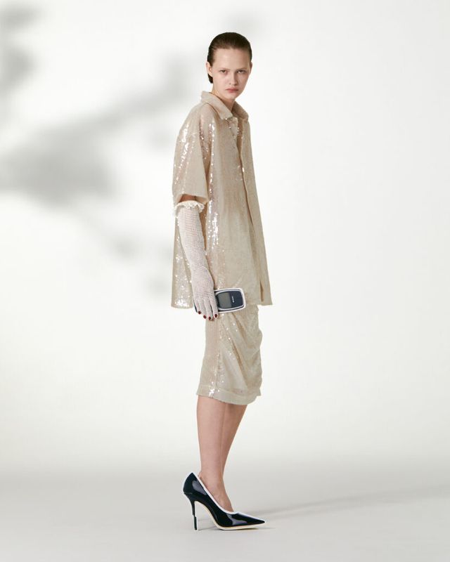 있는 어릴 적 엄마의 방을 떠올리며 컬렉션을 전개했다. 그 때문일까? 시퀸의 컬러, 펄의 배치, 플라워 패턴 레이스, 드레이핑 등에 레트로 감성이 짙게 깃들어 있다. 어린 시절 엄마를 흉내 내고 싶은 마음에 간절히 원했던 휴대폰, 이어링, 하이힐, 칵테일 잔을 가짜로 만들어 들고 있는 것도 이 컬렉션의 재미 중 하나다.
