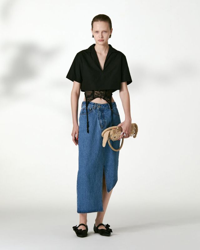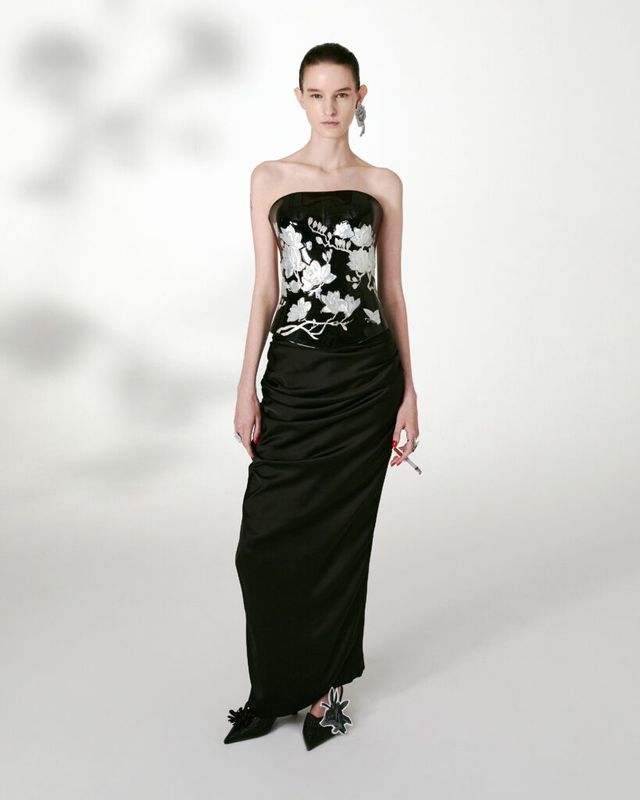 FAVORITE LOOK 자개 장식이 떠오르는 글로시하고 견고한 튜브톱과 드레이핑이 멋스러운 롱스커트를 매치한 룩
