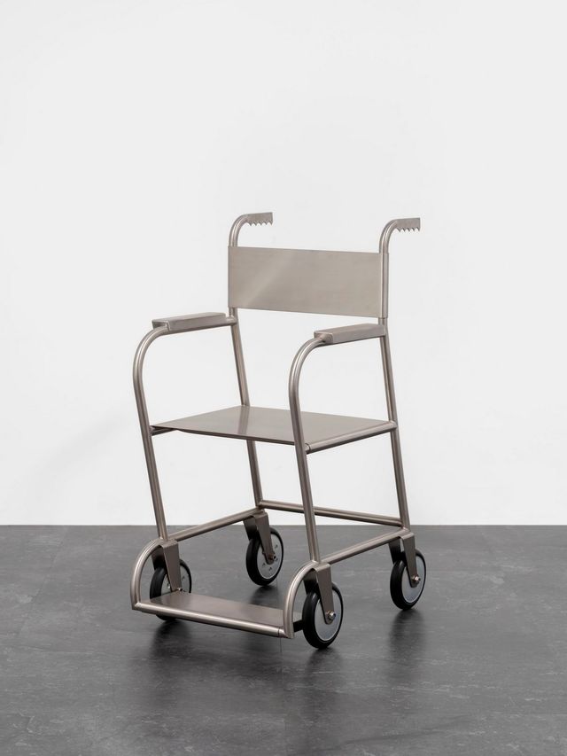 신작 〈분리〉에서는 병원에서 사용하는 칸막이엔 천 대신 가시철조망을 둘러 단절을 이야기했습니다. 이른 시기에 제작한 〈무제(휠체어 II)〉 역시 휠체어 손잡이를 톱날 모양으로 만들어, 돌봄의 도구인 휠체어를 도리어 위협하는 무기로 바꿔놨어요.