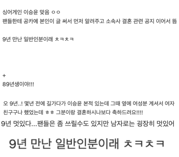 이승윤의 결혼 소식에 팬들과 네티즌들은 “싱어게인 우승 이후 음악에만 집중하는 줄 알았는데 좋은 인연이 있었구나”, “오랜 연애 끝에 결혼이라니 더 따뜻하게 느껴진다”, “행복한 가정 이루길 바란다” 등의 반응을 보이며 축하를 전하고 있다.