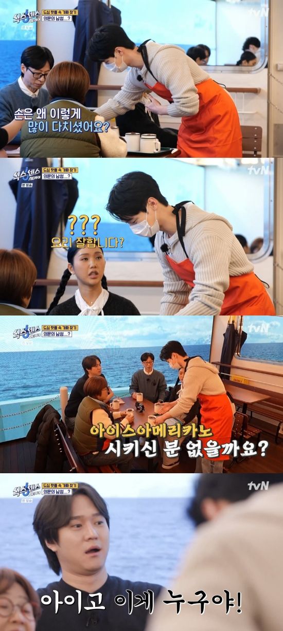 이날 장동윤은 몰래카메라를 하기 위해 직원 행세를 했다. 장동윤은 마스크를 쓴 채 "음료 먼저 준비해 드리겠다"라며 음료를 서빙했고, 고경표는 "되게 잘생기셨다. 손은 왜 이렇게 많이 다치셨냐"라며 관심을 나타냈다.