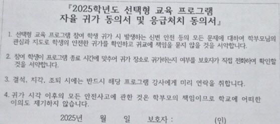 동의서에는 해당 프로그램에 참여하는 학생 귀가 시 발생하는 신변 안전 등의 모든 문제에 대해 학교의 책임을 묻지 않을 것에 서약한다는 내용이 담겨 있다. 또 참여 학생이 프로그램 종료 시간에 맞추어 귀가 장소로 귀가하는지 여부를 보호자가 직접 전화하여 확인해야 하며 귀가 시각 이후의 모든 안전사고에 관한 것은 학부모의 책임으로 학교에 어떠한 이의도 제기하지 않아야 함이 명시됐다.