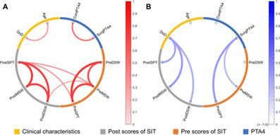 (빨간색은 비례, 파란색은 반비례 관계를 의미한다. 나이는 수술 결과(Post scores of SIT)와 전혀 상관관계가 없다. 난청기간(DoD)는 나이와 약한 상관관계가 있으며, 난청기간이 길수록 수술 결과가 좋지 않다는 사실을 알 수 있다.)