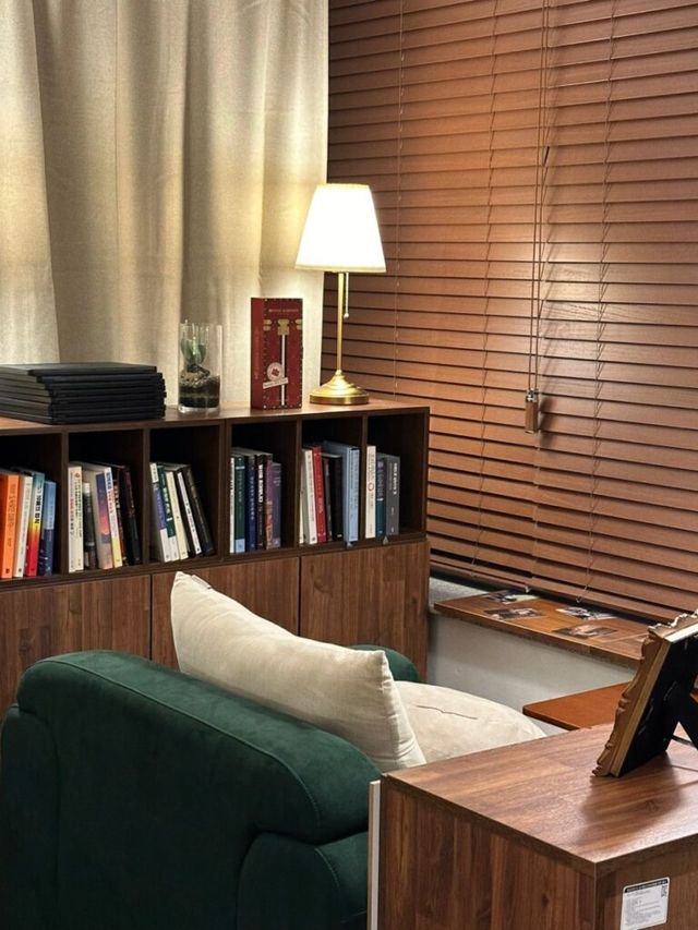 책과 삶이 연결되는 벤의 서재는 마곡역에 위치한 북 카페로, 조용한 분위기에서 책에 집중하고 싶은 사람에게 적합한 공간입니다. 대화 없는 공간으로 운영되어 고요하고 편안한 환경을 제공하는데요, 음료 포함 주류도 판매하고 있어 와인이나 칵테일과 함께 독서를 즐길 수 있습니다. 우드톤의 그린 컬러포인트가 더욱 아늑한 분위기를 만들어주며, 모닥불 홀로그램은 독서를 더욱 몰입할 수 있는 분위기를 만들어 줍니다.