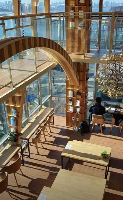 여의도 한강공원 맞은편에 위치한 한강뷰를 즐기며 책과 사람이 만나는 공간 채그로 입니다. 2층 부터 9층 까지 이용 할 수 있어 속이 뻥 뚤리는 기분을 느낄 수 있죠. 따스하게 드는 햇빛과 함께 마포대교뷰를 감상하실 수 있습니다. 아늑한 우드톤 인테리어로 정적인 느낌을 더해주는데요, 넓은 테이블과 다양한 구조로 자유롭게 원하는 자리에서 독서를 즐길 수 있습니다. 분주한 도심 속 나만의 시간을 보내고 싶을 때 방문해보시길.