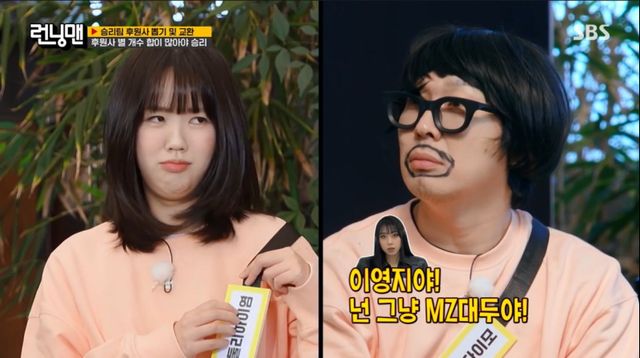 이날 하하는 게임에서 계속 실수하는 지예은을 향해 “쟤 지가 MZ 대통령이라고 한다”고 폭로했다. 이에 지석진은 “MZ 대통령은 김아영”이라고 했고, 하하는 “이영지다. 넌 그냥 MZ 대두”라고 놀렸다.